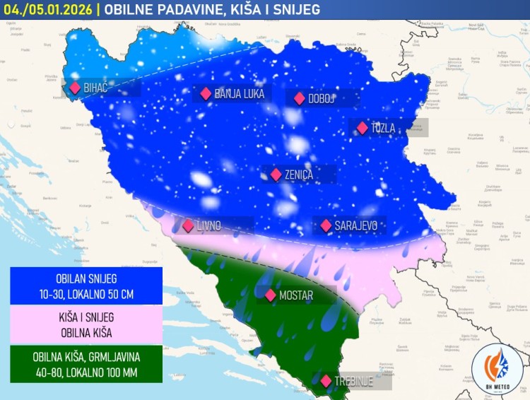 “Spremite lopate za snijeg, neki će usljed teškog i mokrog snijega imati problema sa nestankom električne energije uz probleme na putnim pravcima. Većinu očekuje 10-30, lokalno i do 50 cm snijega”, navodi BHMeteo.